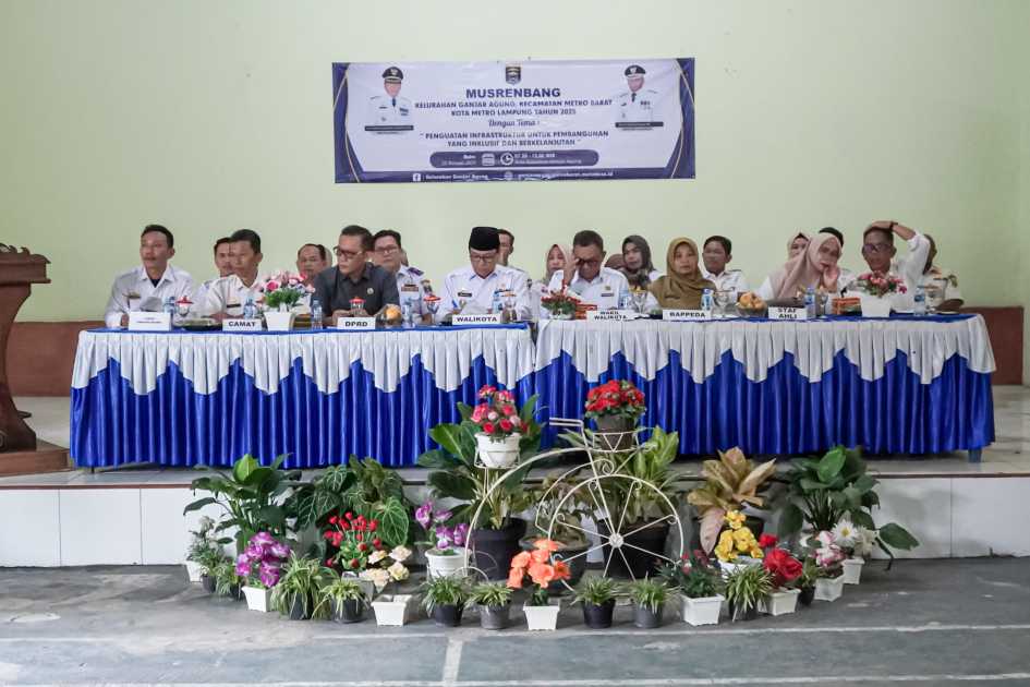 Walikota Metro bersama Wakil Wali Kota Metro menghadiri kegiatan Musrenbang Kelurahan Ganjar Agung Tahun 2025, dalam rangka merumuskan dan menyepakati prioritas pembangunan di tingkat kelurahan yang akan diajukan dalam rencana pembangunan daerah yang dilaksanakan di Aula Kelurahan Ganjar Agung, Rabu (22/01/2024).